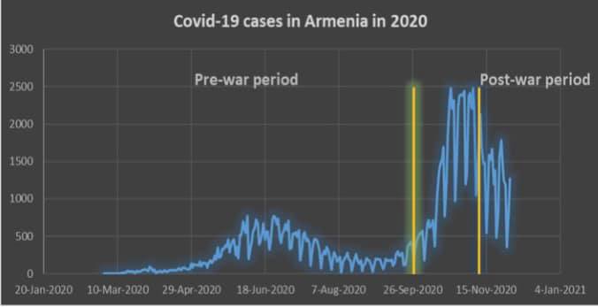 2. պատերազմի ժամանակ՝ միայն 2020թ. սեպտեմբերի 27-ից նոյեմբերի 9-ը, այսինքն` ընդամենը մեկուկես ամսվա ընթացքում այս թիվը հասել է 59287,3. պատերազմից անմիջապես հետո՝ 2020թ. նոյեմբերի 10-ից 30-ը, այսինքն` միայն կես ամսվա ընթացքում`վարակման դեպքերի թիվը հասել է 27280-ի: