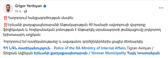 Հիշեցնենք, որ ավելի վաղ  Երևանի ավագանու նախկին անդամ Գրիգոր Երիցյանն էր ֆեյսբուքում գրառում արել՝ կից  հրապարակելով տեսանյութ և հայտնելով, որ Երևանի քաղաքապետարանի ենթակայության 49 համարի ավտոբուսի վարորդը ֆիզիկական և հոգեբանական բռնության է ենթարկել տրանսպորտի թանկացումը բոյկոտող երիտասարդ աղջկան: