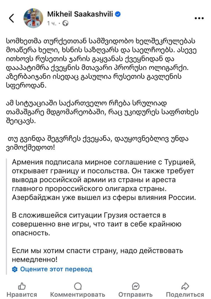 Եթե ցանկանում ենք պահպանել երկիրը, պետք է անհապաղ գործենք»,- սոցցանցի իր էջում գրել է Վրաստանի կալանավորված նախկին նախագահ Միխեիլ Սաակաշվիլին։